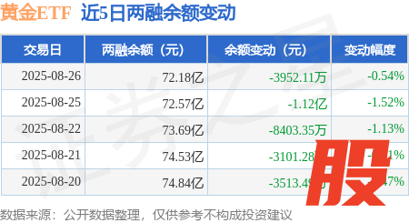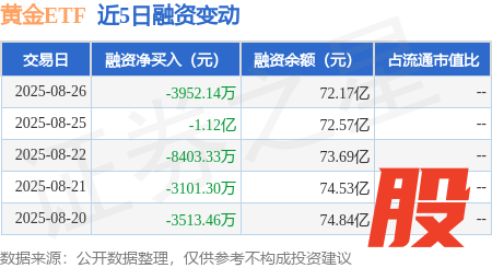 本站消息,8月26日,黄金ETF(518880)融资买入4.11亿元,融资偿还4.5亿元,融资净卖出3952.14万元,融资余额72.17亿元。